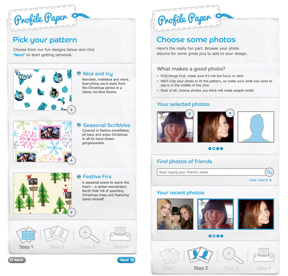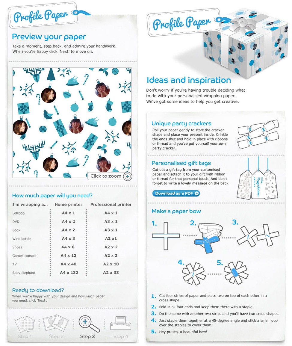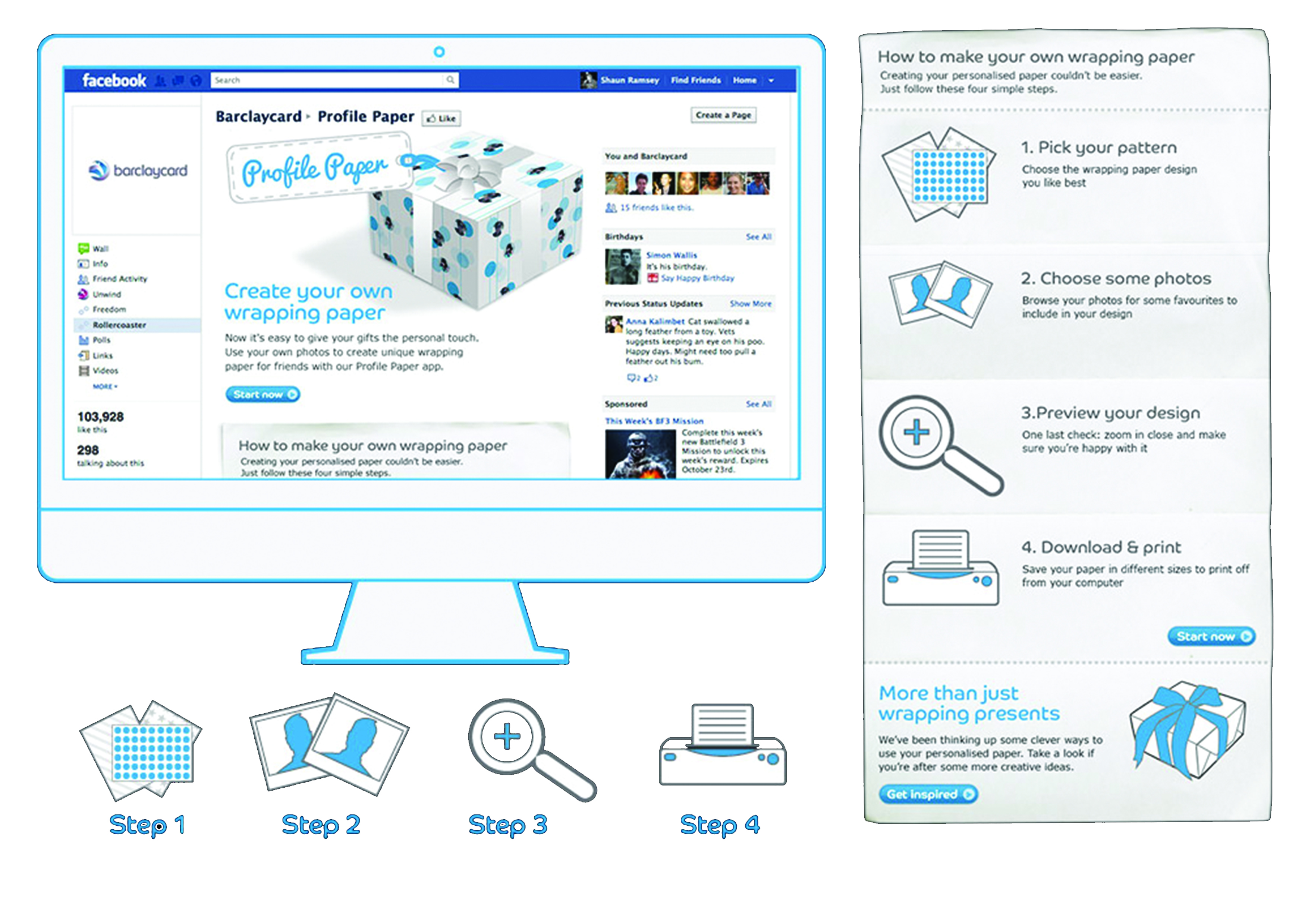 To give your gift a personal touch, we created a Facebook Wrap App for Barclaycard. In only a couple of seconds fans were able to add photos from their albums and print out their own design wrapping paper.